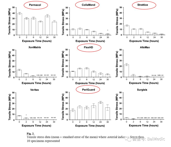 结果——经过30小时候以后,CollaMend,AlloMax,Veritas,Strattice,XenMatrix,Permacol,FlexHD的拉伸强度明显降低,而PeriGuard的拉伸强度反而略有上升。经过交联的牛心包材料(PeriGuard)在任何时间节点的拉伸强度都比没有经过交联的牛心包材料(Veritas)要高。同样地,经过交联的猪皮(Permacol)比没有交联的猪皮(Strattice,XenMatrix)也显示出了相同的特性。